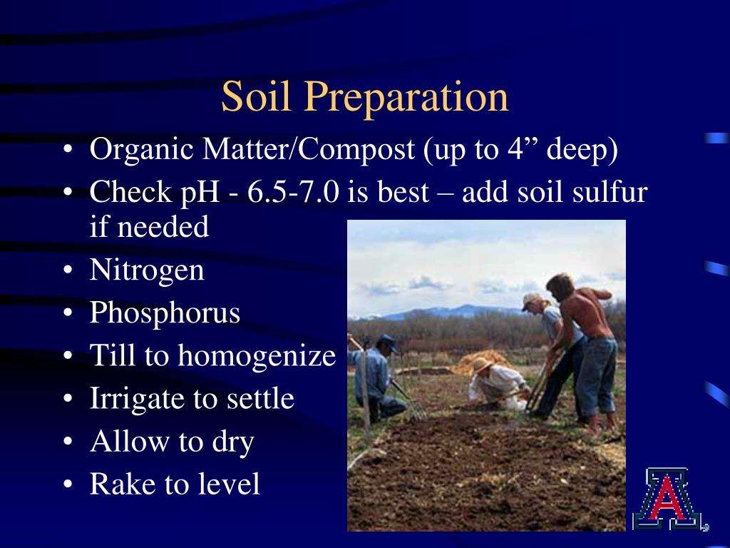 Soil Preparation • Organic Matter/Compost (up to 4” deep) • Check pH - 6.5-7.0 is best – add soil sulfur if needed • Nitrogen • Phosphorus • Till to homogenize • Irrigate to settle • Allow to dry • Rake to level