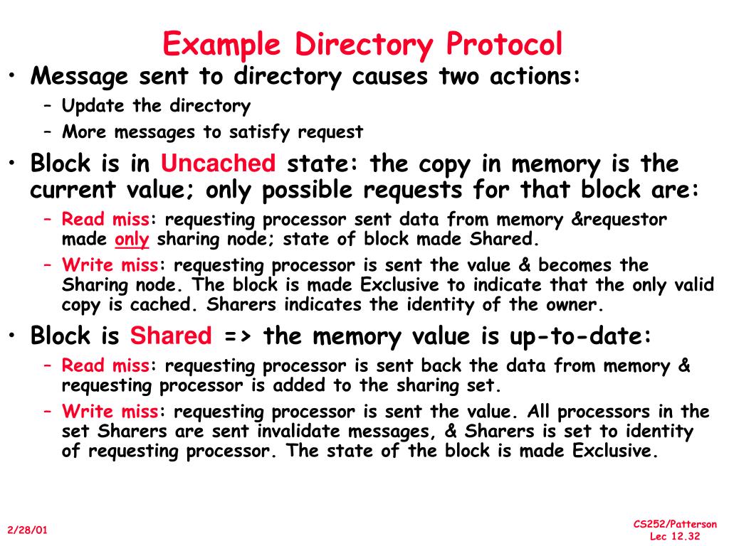 Example Directory Protocol • Message sent to directory causes two actions: • Update the directory • More messages to satisfy request • Block is in Uncached state: the copy in memory is the current value; only possible requests for that block are: • Read miss: requesting processor sent data from memory &requestor made only sharing node; state of block made Shared. • Write miss: requesting processor is sent the value & becomes the Sharing node. The block is made Exclusive to indicate that the only valid copy is cached. Sharers indicates the identity of the owner. • Block is Shared => the memory value is up-to-date: • Read miss: requesting processor is sent back the data from memory & requesting processor is added to the sharing set. • Write miss: requesting processor is sent the value. All processors in the set Sharers are sent invalidate messages, & Sharers is set to identity of requesting processor. The state of the block is made Exclusive.