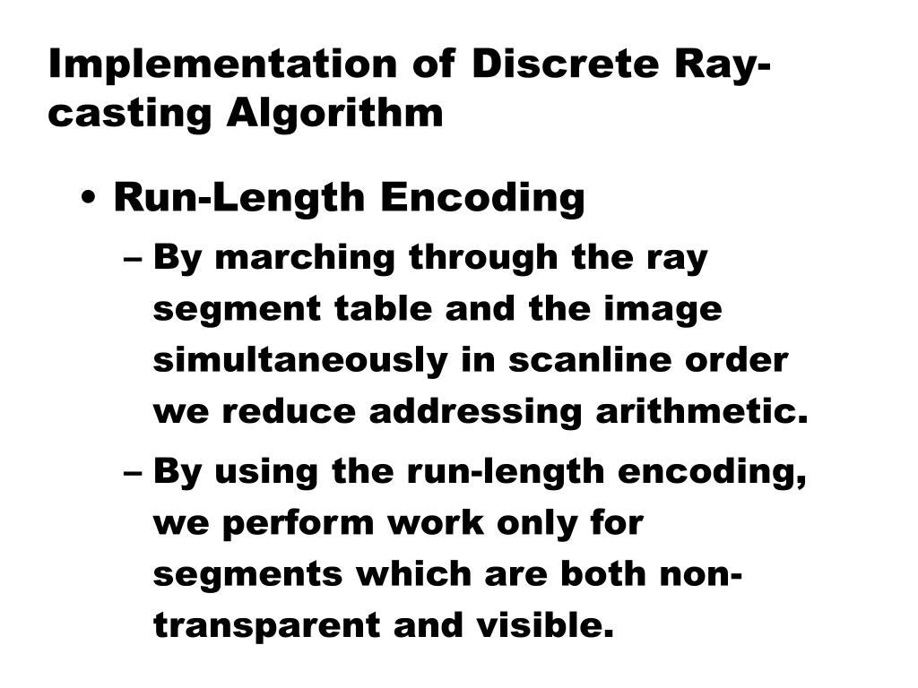Implementation of Discrete Ray-casting Algorithm • Run-Length Encoding • By marching through the ray segment table and the image simultaneously in scanline order we reduce addressing arithmetic. • By using the run-length encoding, we perform work only for segments which are both non-transparent and visible.