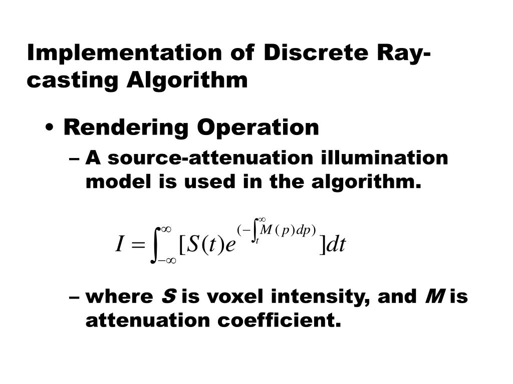 Implementation of Discrete Ray-casting Algorithm • Rendering Operation • A source-attenuation illumination model is used in the algorithm. • where S is voxel intensity, and M is attenuation coefficient.