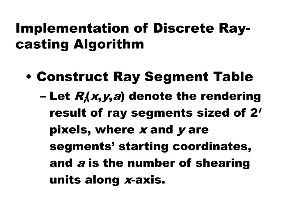 Implementation of Discrete Ray-casting Algorithm • Construct Ray Segment Table • Let Ri(x,y,a) denote the rendering result of ray segments sized of 2i pixels, where x and y are segments’ starting coordinates, and a is the number of shearing units along x-axis.