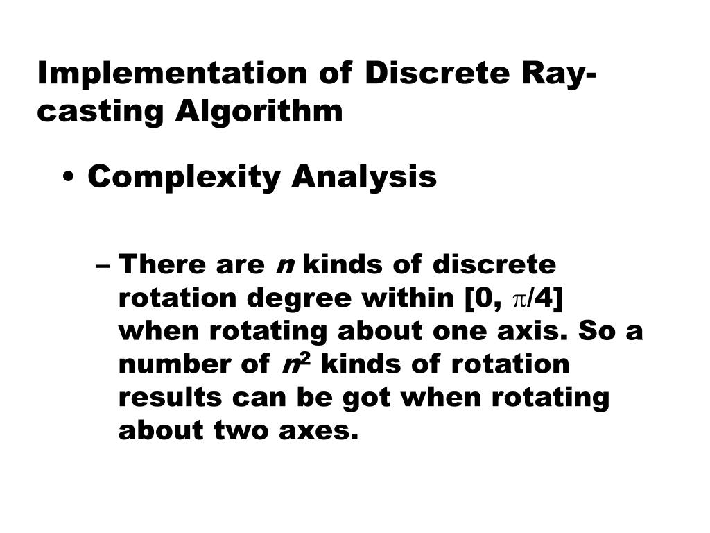 Implementation of Discrete Ray-casting Algorithm • Complexity Analysis • There are n kinds of discrete rotation degree within [0, /4] when rotating about one axis. So a number of n2 kinds of rotation results can be got when rotating about two axes.