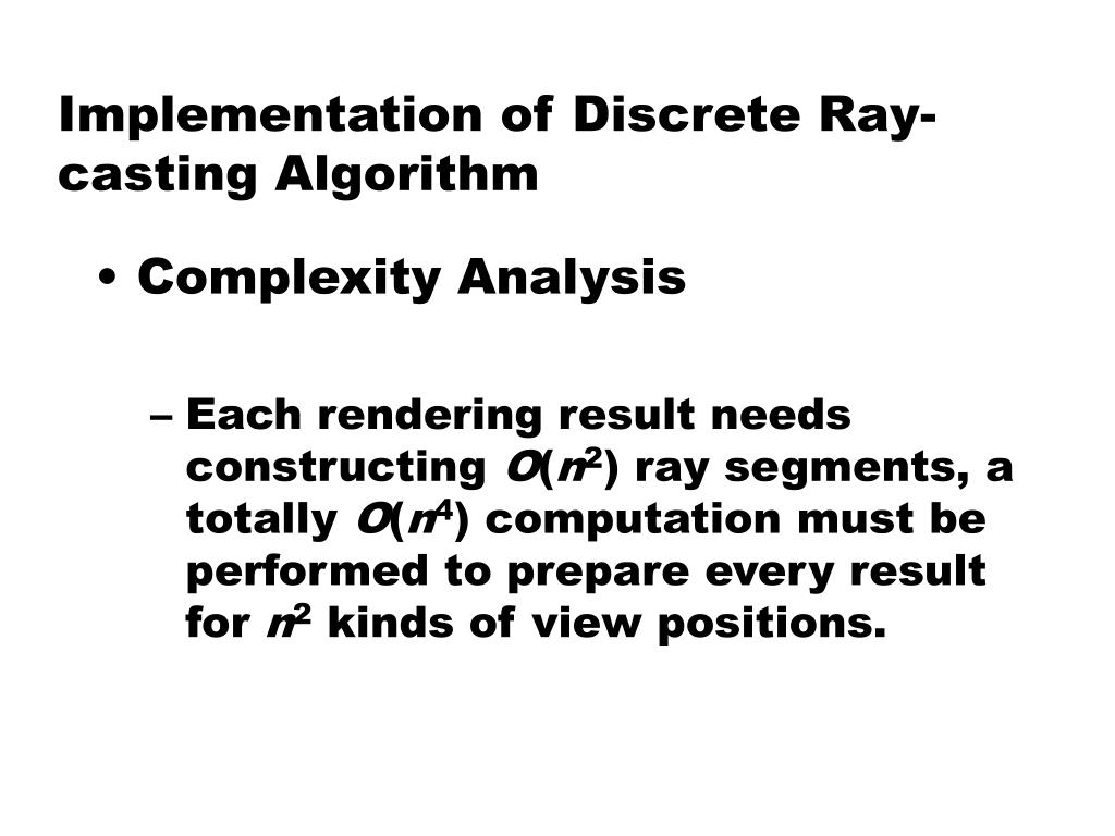 Implementation of Discrete Ray-casting Algorithm • Complexity Analysis • On average, a frame can be computed with a complexity of only O(n2), while traditional algorithm requires O(n3).