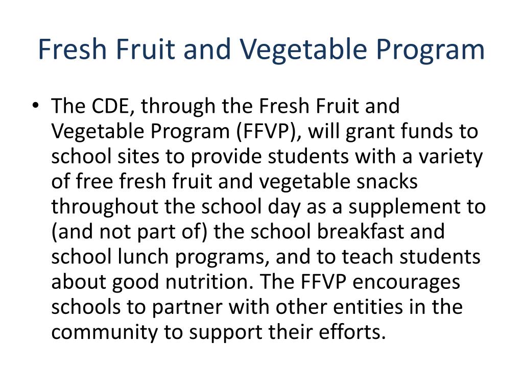 Fresh Fruit and Vegetable Program • The CDE, through the Fresh Fruit and Vegetable Program (FFVP), will grant funds to school sites to provide students with a variety of free fresh fruit and vegetable snacks throughout the school day as a supplement to (and not part of) the school breakfast and school lunch programs, and to teach students about good nutrition. The FFVP encourages schools to partner with other entities in the community to support their efforts.