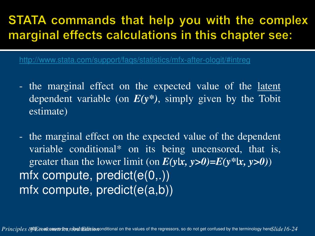 STATA commands that help you with the complex marginal effects calculations in this chapter see: http://www.stata.com/support/faqs/statistics/mfx-after-ologit/#intreg By default Stata chooses the effect on the latent variable option, which are exactly the same as the coefficients estimated by -tobit-. You will have to specify the -predict()- option in -mfx- to get the other marginal effects. See help mfx- help tobitpostestimation- Principles of Econometrics, 3rd Edition