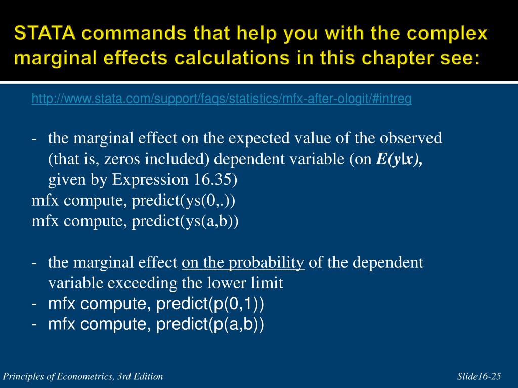 STATA commands that help you with the complex marginal effects calculations in this chapter see: • http://www.stata.com/support/faqs/statistics/mfx-after-ologit/#intreg • the marginal effect on the expected value of the observed (that is, zeros included) dependent variable (on E(y|x), given by Expression 16.35) • mfx compute, predict(ys(0,.)) • mfx compute, predict(ys(a,b)) • the marginal effect on the probability of the dependent variable exceeding the lower limit • mfx compute, predict(p(0,1)) • mfx compute, predict(p(a,b)) Principles of Econometrics, 3rd Edition