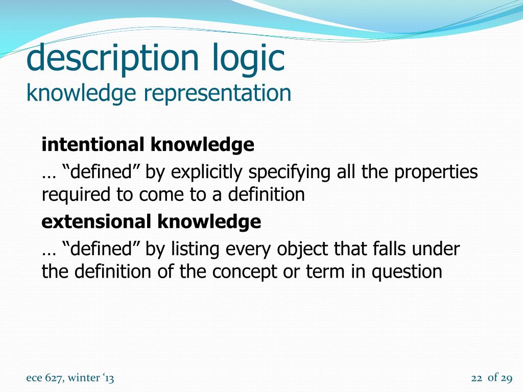 description logicknowledge representation intentional knowledge … “defined” by explicitly specifying all the properties required to come to a definition extensional knowledge … “defined” by listing every object that falls under the definition of the concept or term in question