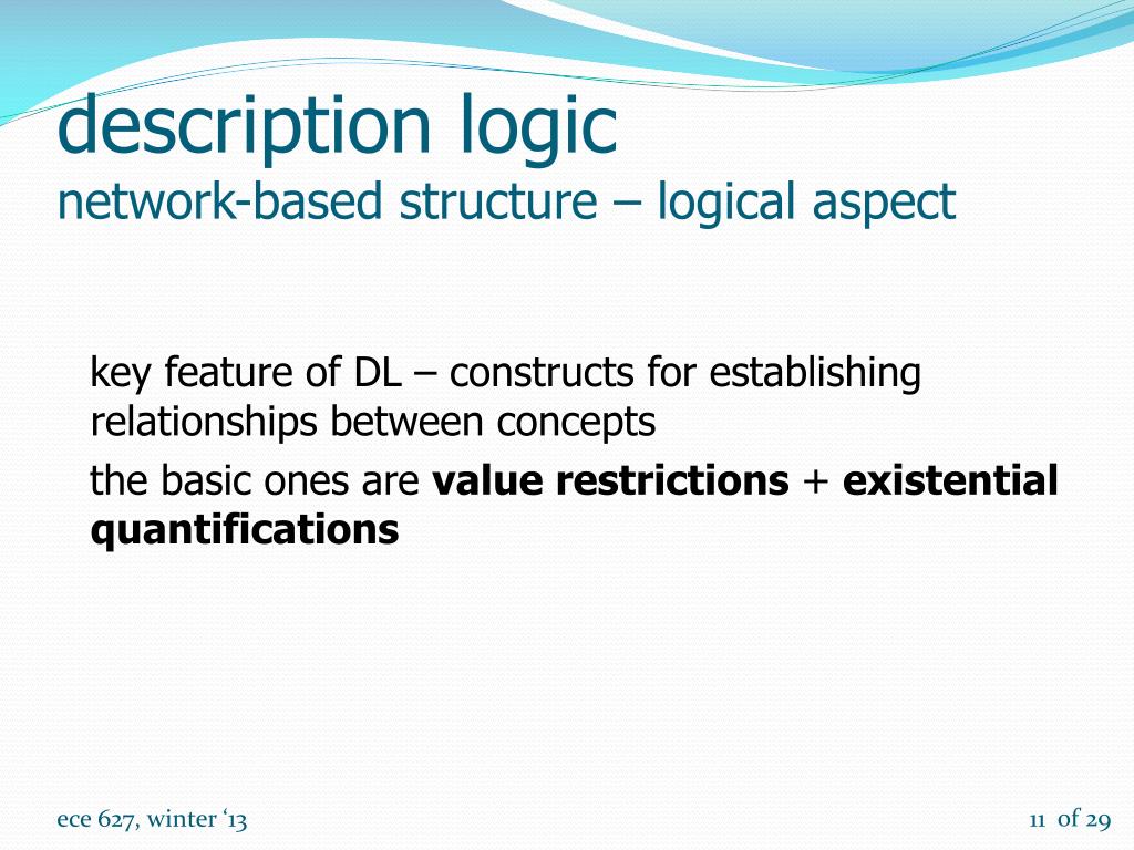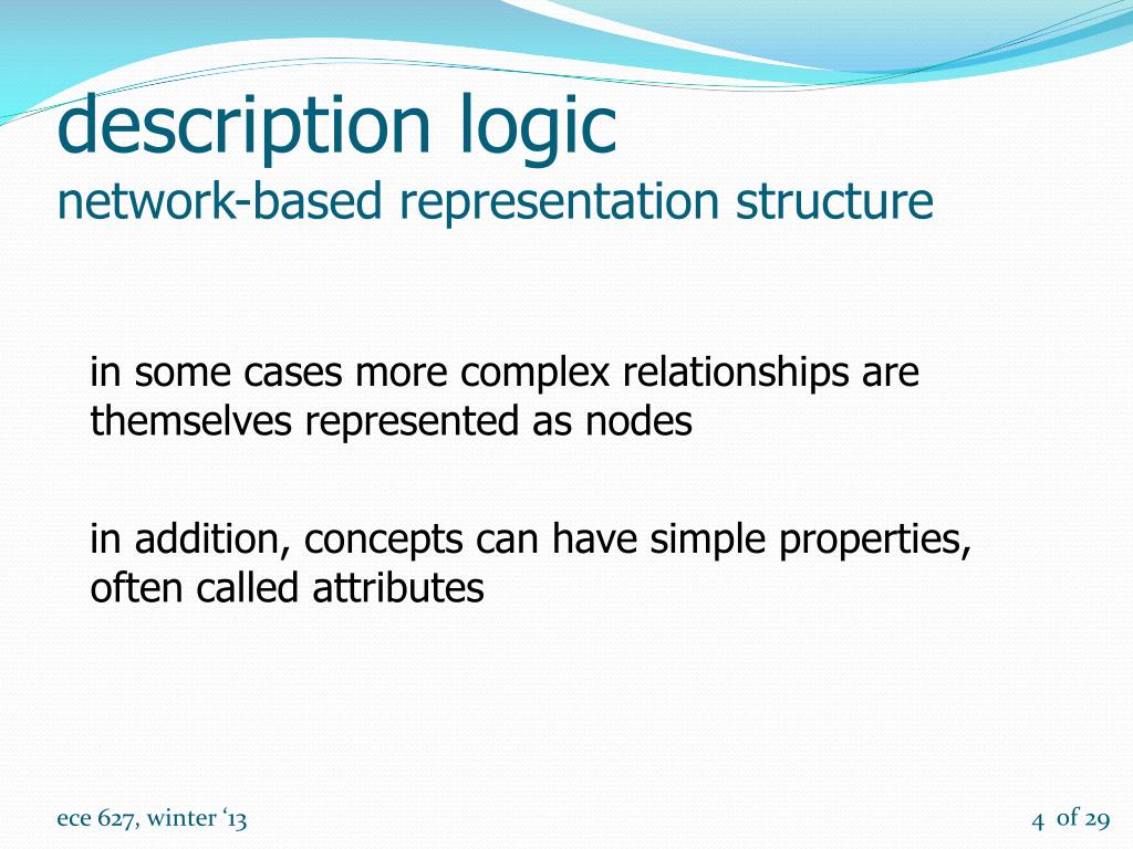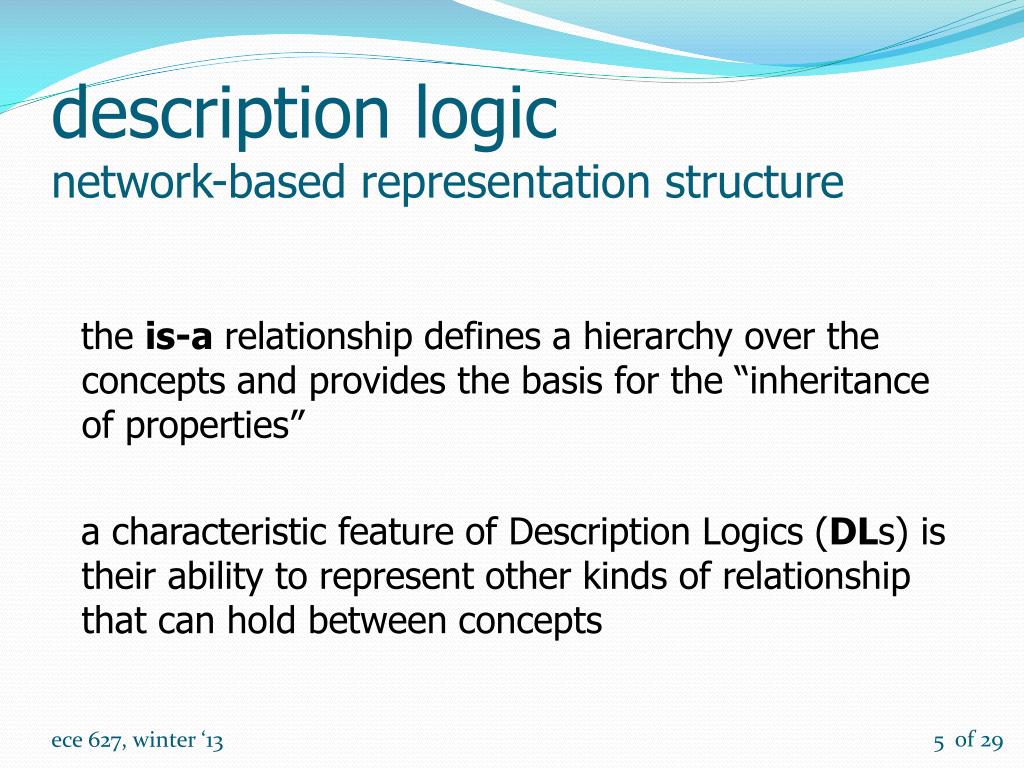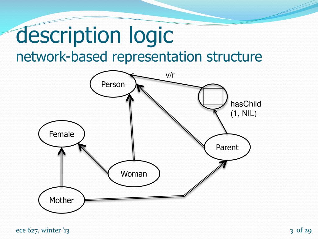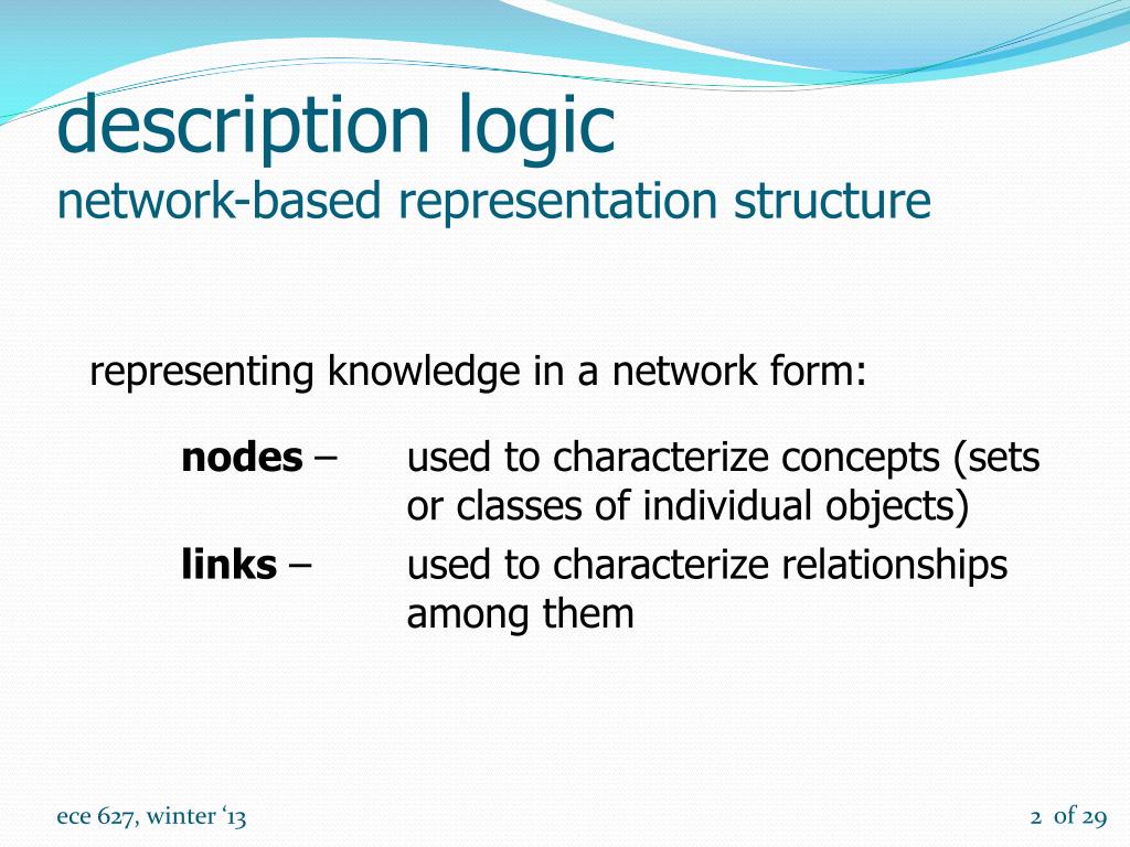 e ce 627 intelligent web: ontology and beyond. lecture 15: description logic - introduction. description logic network-based representation structure. representing knowledge in a network form: nodes – used to characterize concepts (sets or classes of individual objects)