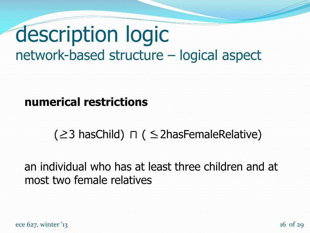 description logicnetwork-based structure – logical aspect numerical restrictions ( 3 hasChild) ( 2hasFemaleRelative) an individual who has at least three children and at most two female relatives