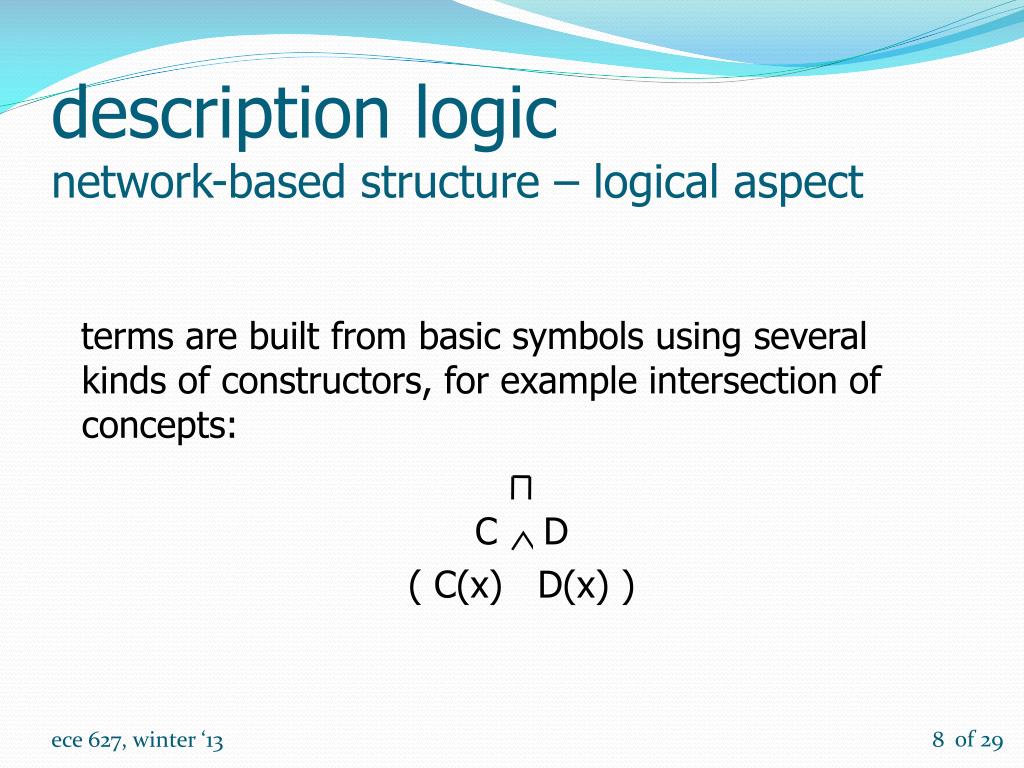 description logicnetwork-based structure – logical aspect terms are built from basic symbols using several kinds of constructors, for example intersection of concepts: C D ( C(x) D(x) )