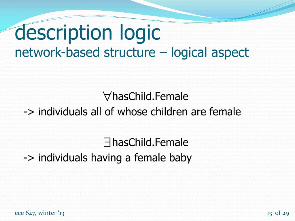 description logicnetwork-based structure – logical aspect hasChild.Female -> individuals all of whose children are female hasChild.Female -> individuals having a female baby
