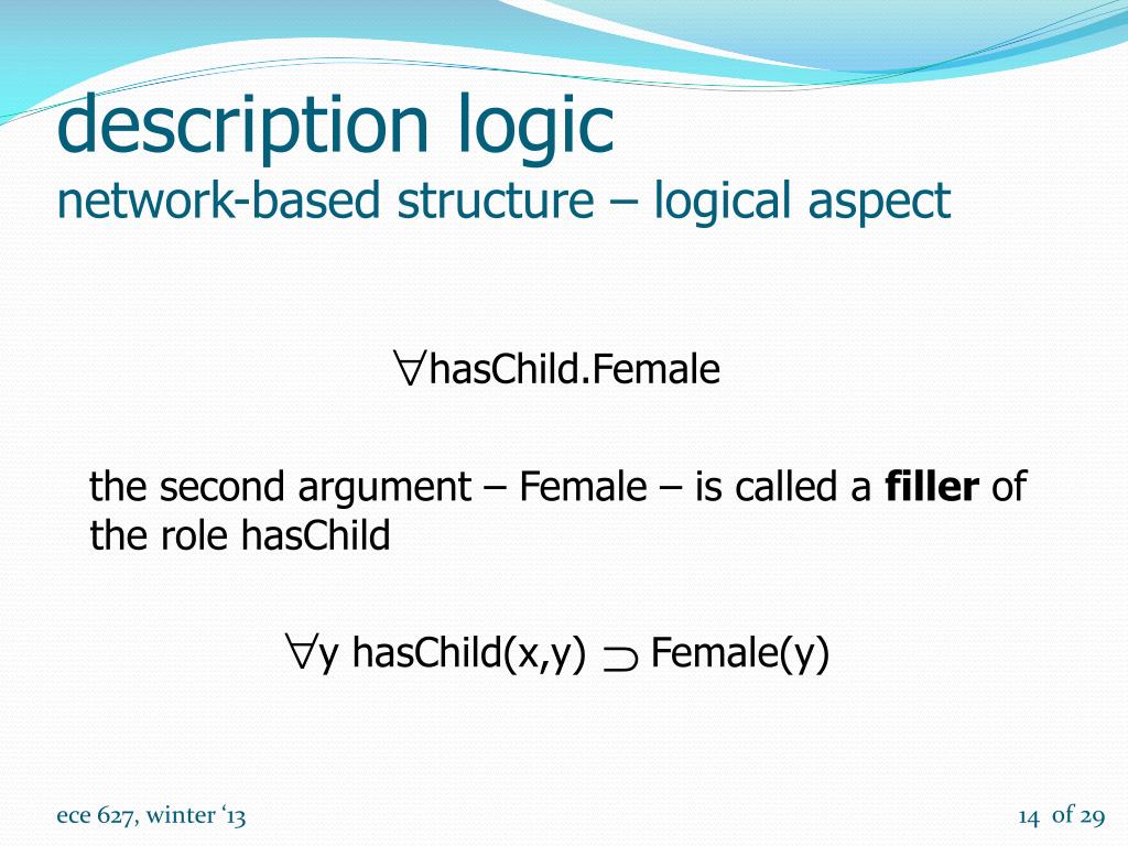 description logicnetwork-based structure – logical aspect hasChild.Female the second argument – Female – is called a filler of the role hasChild y hasChild(x,y) Female(y)