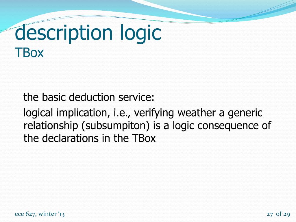 description logicTBox the basic deduction service: logical implication, i.e., verifying weather a generic relationship (subsumpiton) is a logic consequence of the declarations in the TBox