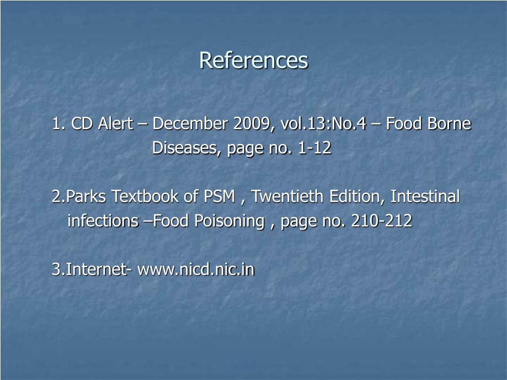 References 1. CD Alert – December 2009, vol.13:No.4 – Food Borne Diseases, page no. 1-12 2.Parks Textbook of PSM , Twentieth Edition, Intestinal infections –Food Poisoning , page no. 210-212 3.Internet- www.nicd.nic.in