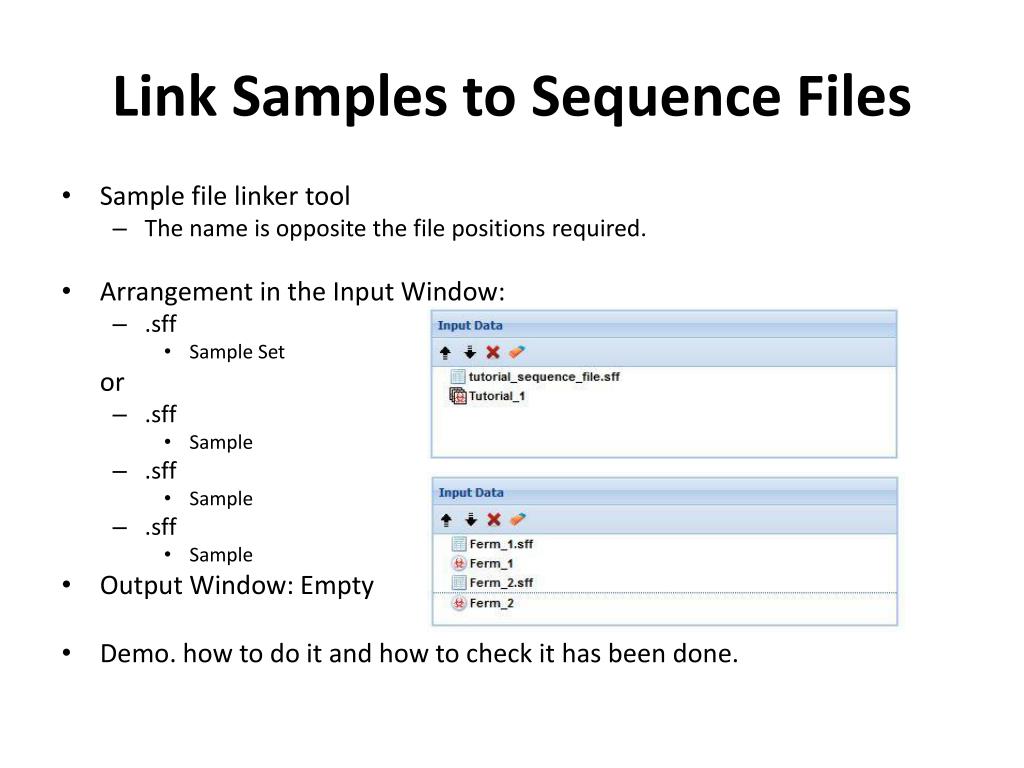 Link Samples to Sequence Files • Sample file linker tool • The name is opposite the file positions required. • Arrangement in the Input Window: • .sff • Sample Set or • .sff • Sample • .sff • Sample • .sff • Sample • Output Window: Empty • Demo. how to do it and how to check it has been done.