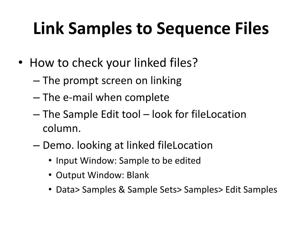 Link Samples to Sequence Files • How to check your linked files? • The prompt screen on linking • The e-mail when complete • The Sample Edit tool – look for fileLocation column. • Demo. looking at linked fileLocation • Input Window: Sample to be edited • Output Window: Blank • Data> Samples & Sample Sets> Samples> Edit Samples