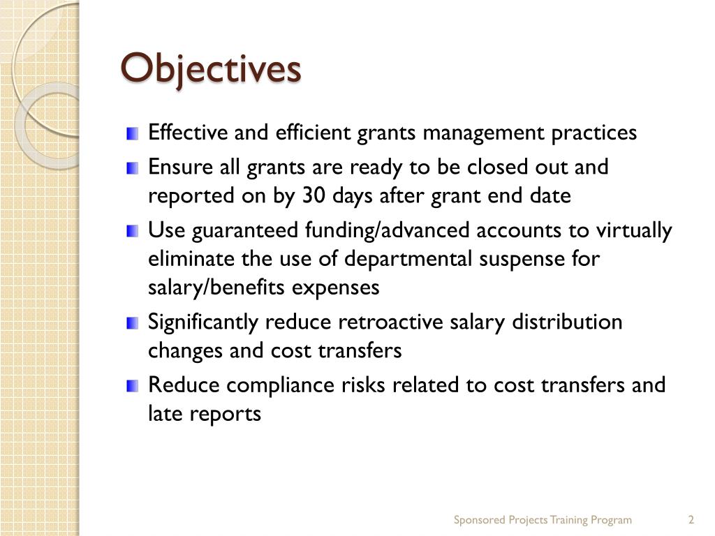 Objectives • Effective and efficient grants management practices • Ensure all grants are ready to be closed out and reported on by 30 days after grant end date • Use guaranteed funding/advanced accounts to virtually eliminate the use of departmental suspense for salary/benefits expenses • Significantly reduce retroactive salary distribution changes and cost transfers • Reduce compliance risks related to cost transfers and late reports Sponsored Projects Training Program