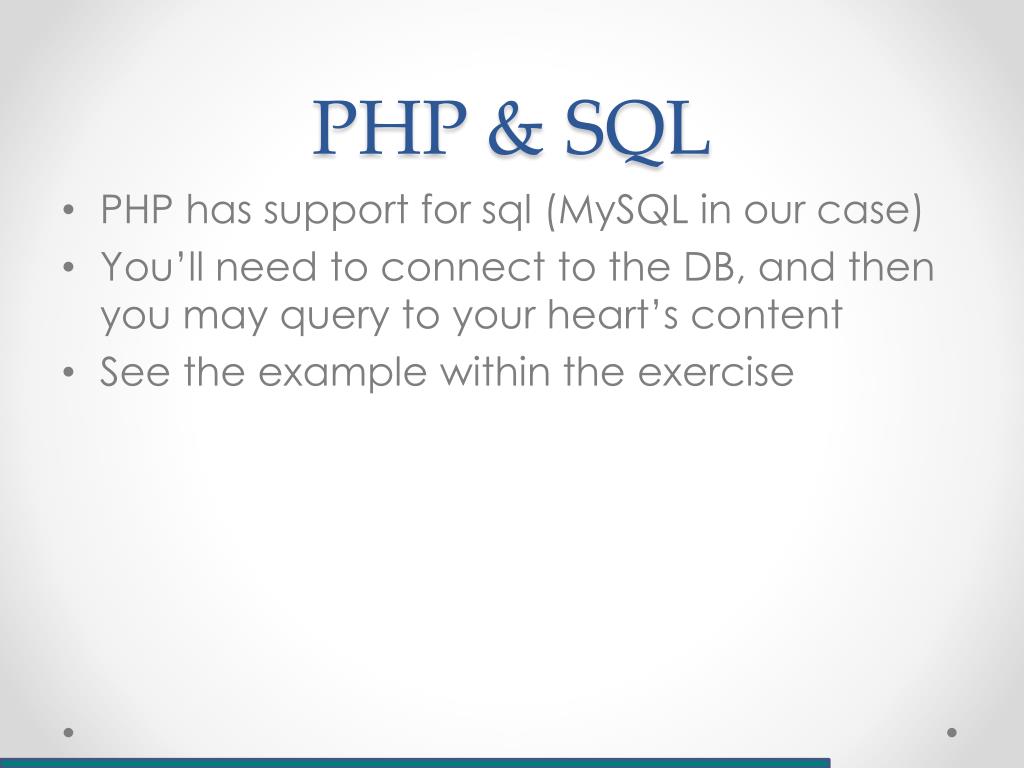 PHP & SQL • PHP has support for sql (MySQL in our case) • You’ll need to connect to the DB, and then you may query to your heart’s content • See the example within the exercise