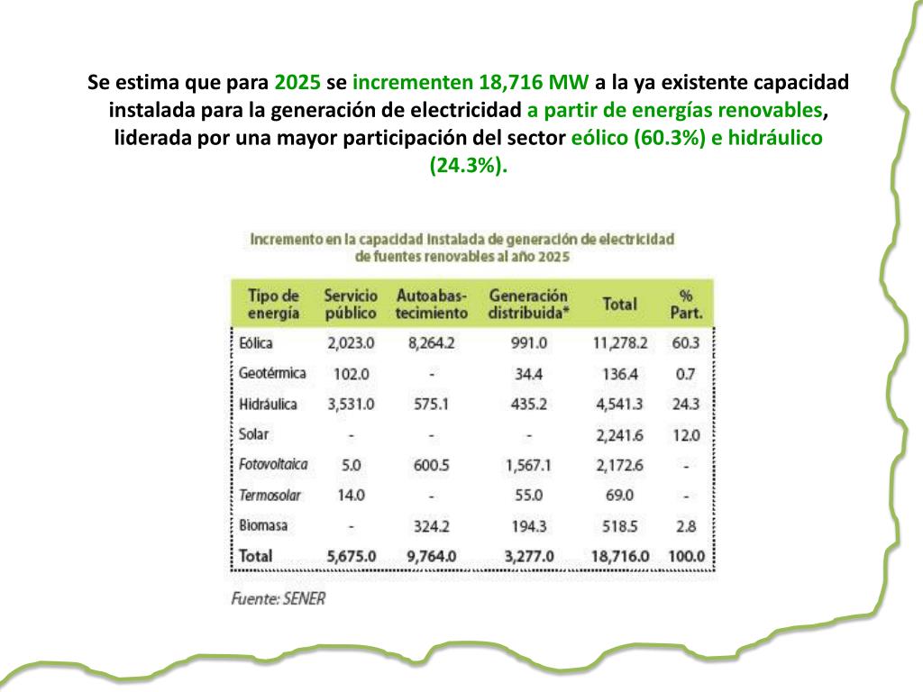 Se estima que para 2025 se incrementen 18,716 MW a la ya existente capacidad instalada para la generación de electricidad a partir de energías renovables, liderada por una mayor participación del sector eólico (60.3%) e hidráulico (24.3%).