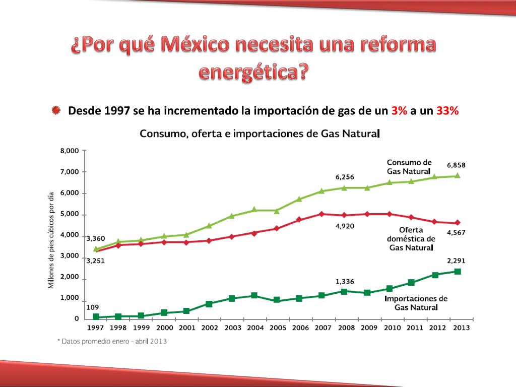 ¿Por qué México necesita una reforma energética? • Desde 1997 se ha incrementado la importación de gas de un 3% a un 33%