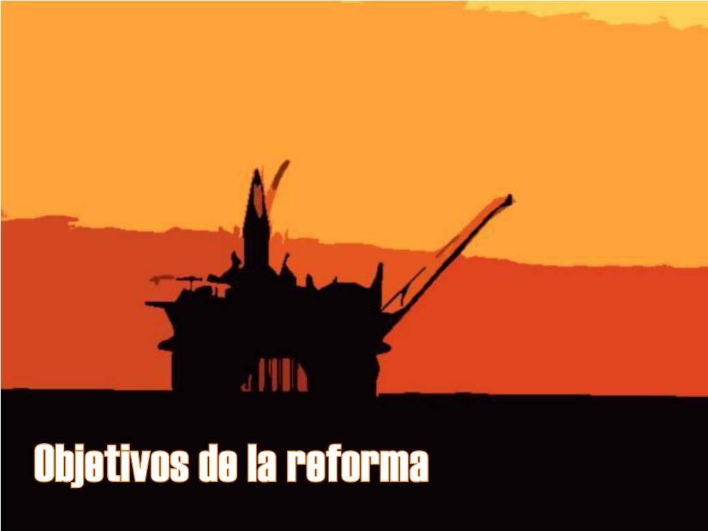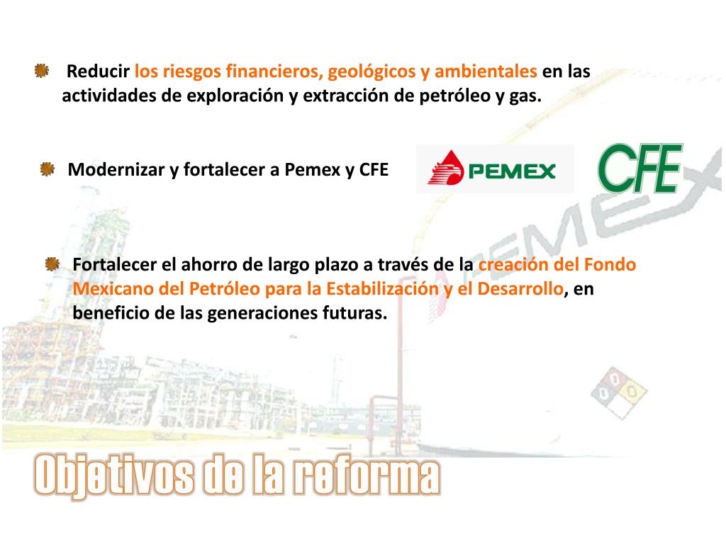 Reducir los riesgos financieros, geológicos y ambientales en las actividades de exploración y extracción de petróleo y gas. • Modernizar y fortalecer a Pemex y CFE • Fortalecer el ahorro de largo plazo a través de la creación del Fondo Mexicano del Petróleopara la Estabilización y el Desarrollo, en beneficio de las generaciones futuras. Objetivos de la reforma