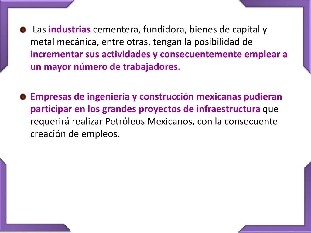 Las industrias cementera, fundidora, bienes de capital y metal mecánica, entre otras, tengan la posibilidad de incrementar sus actividades y consecuentemente emplear a un mayor número de trabajadores. • Empresas de ingeniería y construcción mexicanas pudieran participar en los grandes proyectos de infraestructura que requerirá realizar Petróleos Mexicanos, con la consecuente creación de empleos.