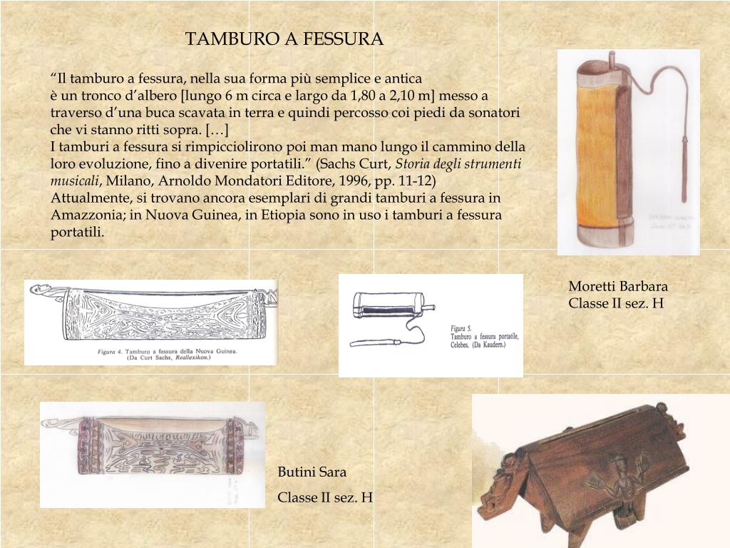 TAMBURO A FESSURA “Il tamburo a fessura, nella sua forma più semplice e antica è un tronco d’albero [lungo 6 m circa e largo da 1,80 a 2,10 m] messo a traverso d’una buca scavata in terra e quindi percosso coi piedi da sonatori che vi stanno ritti sopra. […] I tamburi a fessura si rimpicciolirono poi man mano lungo il cammino della loro evoluzione, fino a divenire portatili.” (Sachs Curt, Storia degli strumenti musicali, Milano, Arnoldo Mondatori Editore, 1996, pp. 11-12) Attualmente, si trovano ancora esemplari di grandi tamburi a fessura in Amazzonia; in Nuova Guinea, in Etiopia sono in uso i tamburi a fessura portatili. Moretti Barbara Classe II sez. H Butini Sara Classe II sez. H