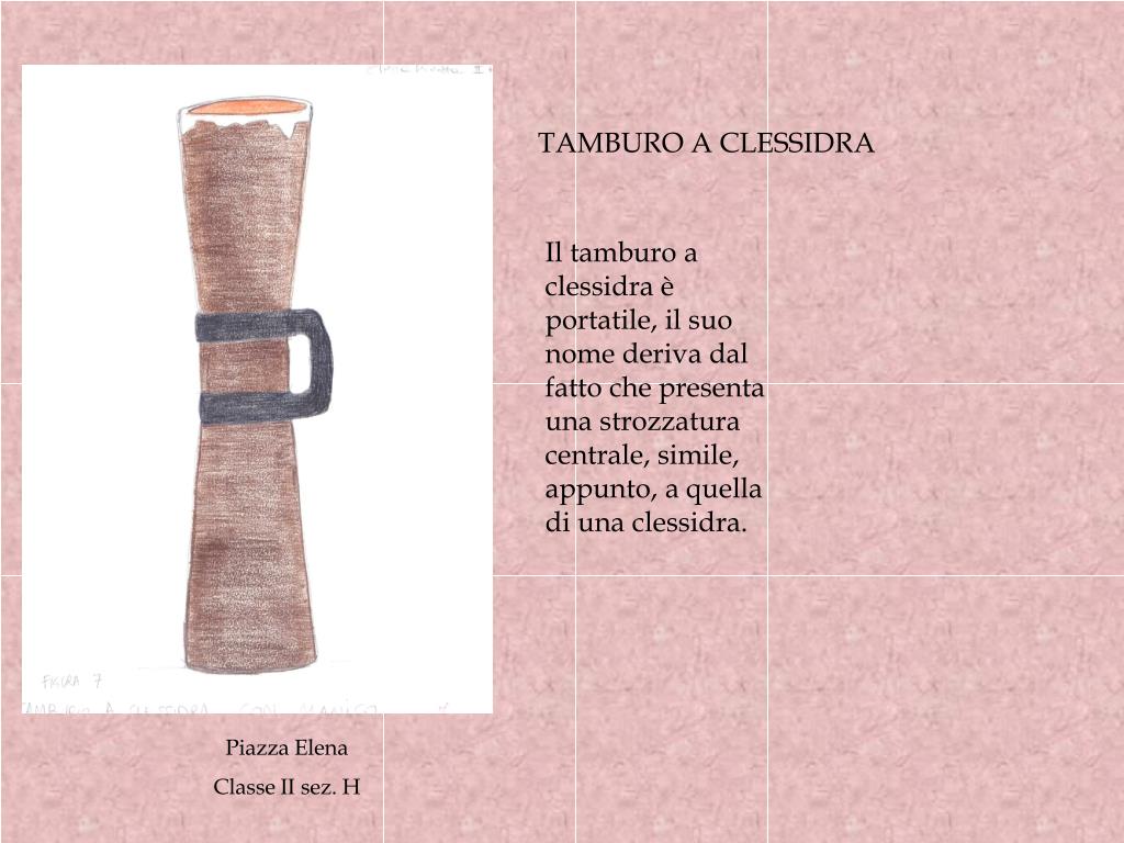 TAMBURO A CLESSIDRA Il tamburo a clessidra è portatile, il suo nome deriva dal fatto che presenta una strozzatura centrale, simile, appunto, a quella di una clessidra. Piazza Elena Classe II sez. H