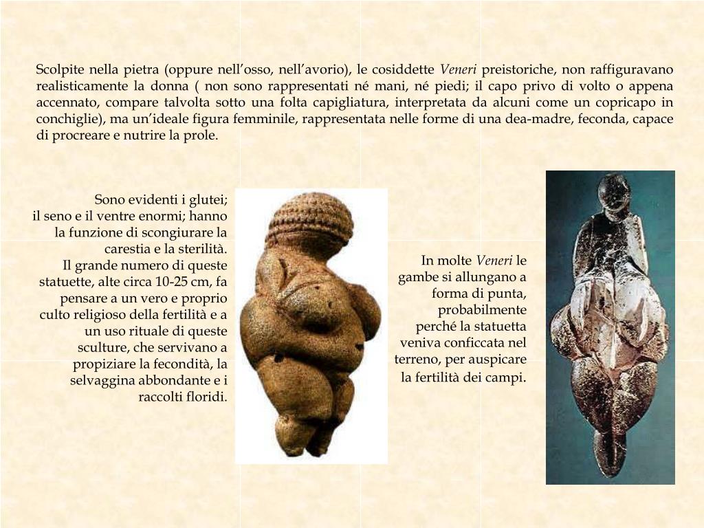 Scolpite nella pietra (oppure nell’osso, nell’avorio), le cosiddette Veneri preistoriche, non raffiguravano realisticamente la donna ( non sono rappresentati né mani, né piedi; il capo privo di volto o appena accennato, compare talvolta sotto una folta capigliatura, interpretata da alcuni come un copricapo in conchiglie), ma un’ideale figura femminile, rappresentata nelle forme di una dea-madre, feconda, capace di procreare e nutrire la prole. Sono evidenti i glutei; il seno e il ventre enormi; hanno la funzione di scongiurare la carestia e la sterilità. Il grande numero di queste statuette, alte circa 10-25 cm, fa pensare a un vero e proprio culto religioso della fertilità e a un uso rituale di queste sculture, che servivano a propiziare la fecondità, la selvaggina abbondante e i raccolti floridi. In molte Veneri le gambe si allungano a forma di punta, probabilmente perché la statuetta veniva conficcata nel terreno, per auspicare la fertilità dei campi.