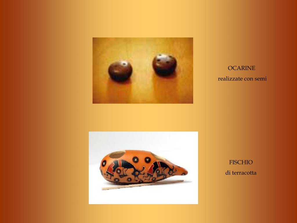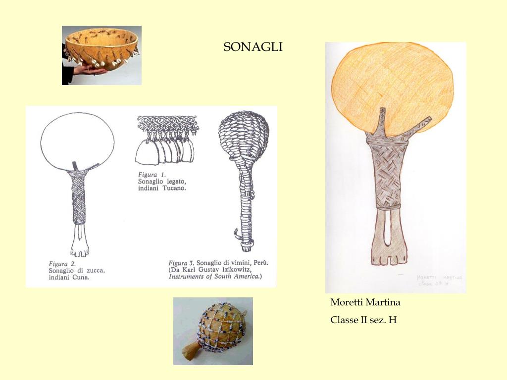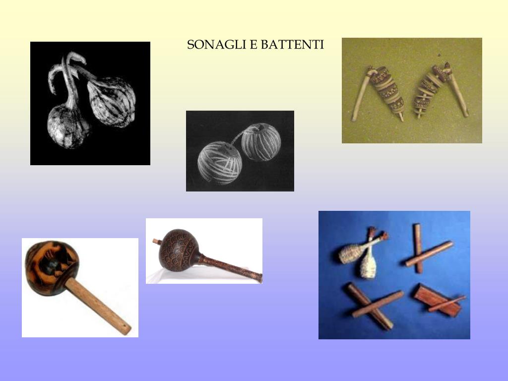 SONAGLI “Il sonaglio è uno strumento composto da un certo numero di piccoli corpi duri che si percuotono tra loro a seguito dell’azione di scuotimento del sonatore”. (Sachs Curt, Storia degli strumenti musicali, Milano, Arnaldo Mondatori editore, 1996, p. 7) Gusci di noce, semi, noccioli, denti e zoccoli di animali, conchiglie, pietre…possono essere uniti tra loro con una treccia o una cordicella o legati in un grappolo (sonagli a grappolo). Dagli scavi archeologici, sappiamo che i sonagli erano in uso presso i cacciatori del periodo paleolitico. In tempi moderni, sono ancora utilizzati, come strumenti magici e propiziatori; che possono scandire i passi di danza, presso culture tribali poco sviluppate; il danzatore può portarli appesi alle caviglie, alle ginocchia, alla vita, al collo. Sonagli di zucca, vimini, legno, argilla, metallo, tuttora usati in molti riti sciamanici1, può essere facilmente costruiti, riempiendo il contenitore di sassolini o granelli di materia dura. 1. Il suono penetrante può far cadere in trance lo sciamano e i partecipanti al rito.
