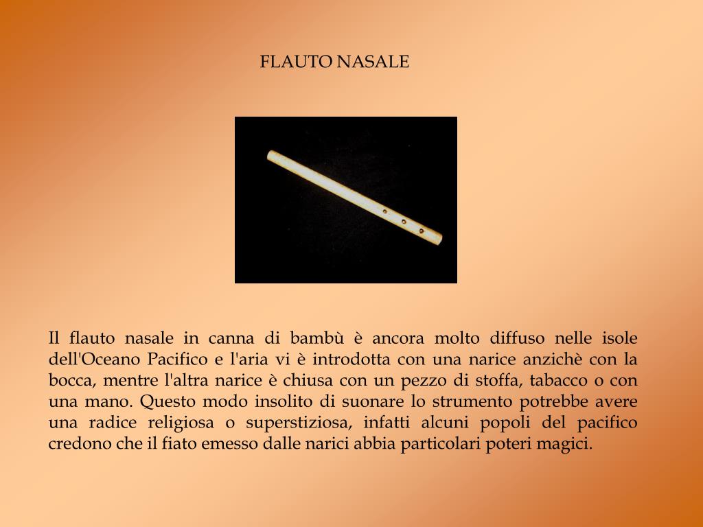 FLAUTO NASALE Il flauto nasale in canna di bambù è ancora molto diffuso nelle isole dell'Oceano Pacifico e l'aria vi è introdotta con una narice anzichè con la bocca, mentre l'altra narice è chiusa con un pezzo di stoffa, tabacco o con una mano. Questo modo insolito di suonare lo strumento potrebbe avere una radice religiosa o superstiziosa, infatti alcuni popoli del pacifico credono che il fiato emesso dalle narici abbia particolari poteri magici.