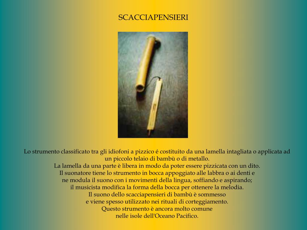 SCACCIAPENSIERI Lo strumento classificato tra gli idiofoni a pizzico é costituito da una lamella intagliata o applicata ad un piccolo telaio di bambù o di metallo. La lamella da una parte è libera in modo da poter essere pizzicata con un dito. Il suonatore tiene lo strumento in bocca appoggiato alle labbra o ai denti e ne modula il suono con i movimenti della lingua, soffiando e aspirando; il musicista modifica la forma della bocca per ottenere la melodia. Il suono dello scacciapensieri di bambù è sommesso e viene spesso utilizzato nei rituali di corteggiamento. Questo strumento è ancora molto comune nelle isole dell'Oceano Pacifico.