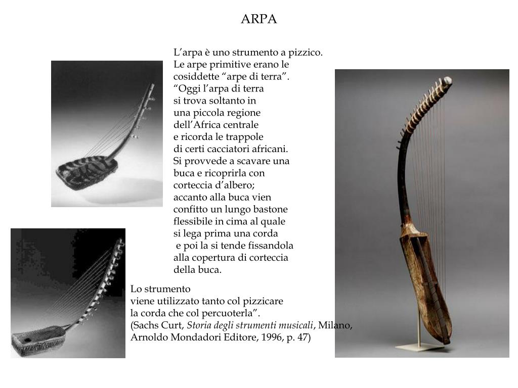 ARPA L’arpa è uno strumento a pizzico. Le arpe primitive erano le cosiddette “arpe di terra”. “Oggi l’arpa di terra si trova soltanto in una piccola regione dell’Africa centrale e ricorda le trappole di certi cacciatori africani. Si provvede a scavare una buca e ricoprirla con corteccia d’albero; accanto alla buca vien confitto un lungo bastone flessibile in cima al quale si lega prima una corda e poi la si tende fissandola alla copertura di corteccia della buca. Lo strumento viene utilizzato tanto col pizzicare la corda che col percuoterla”. (Sachs Curt, Storia degli strumenti musicali, Milano, Arnoldo Mondadori Editore, 1996, p. 47)