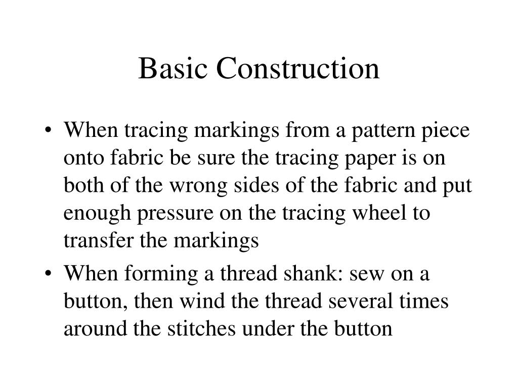 Basic Construction • When tracing markings from a pattern piece onto fabric be sure the tracing paper is on both of the wrong sides of the fabric and put enough pressure on the tracing wheel to transfer the markings • When forming a thread shank: sew on a button, then wind the thread several times around the stitches under the button