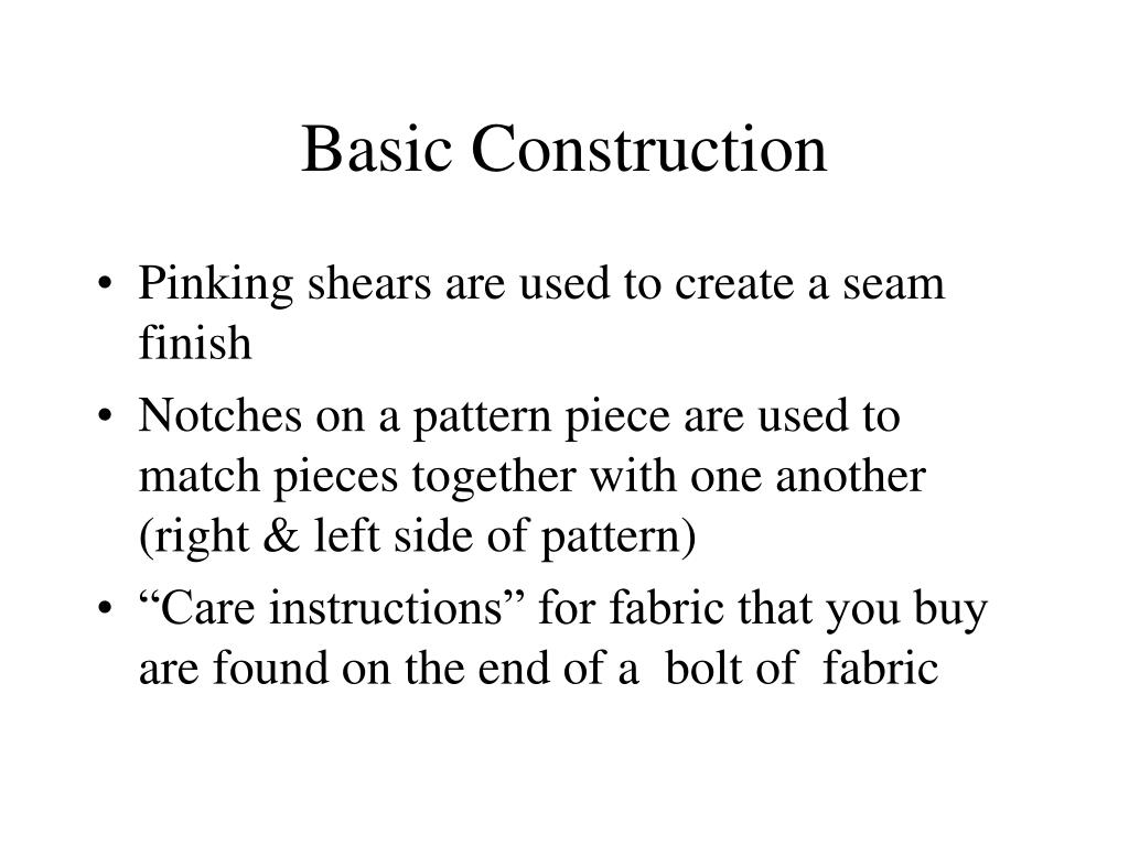 Basic Construction • Pinking shears are used to create a seam finish • Notches on a pattern piece are used to match pieces together with one another (right & left side of pattern) • “Care instructions” for fabric that you buy are found on the end of a bolt of fabric