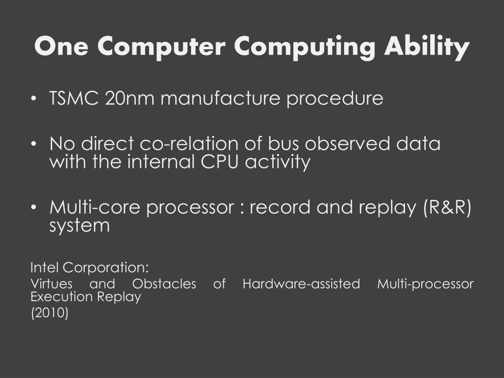 One Computer Computing Ability • TSMC 20nm manufacture procedure • No direct co-relation of bus observed data with the internal CPU activity • Multi-core processor : record and replay (R&R) system Intel Corporation: Virtues and Obstacles of Hardware-assisted Multi-processor Execution Replay (2010)
