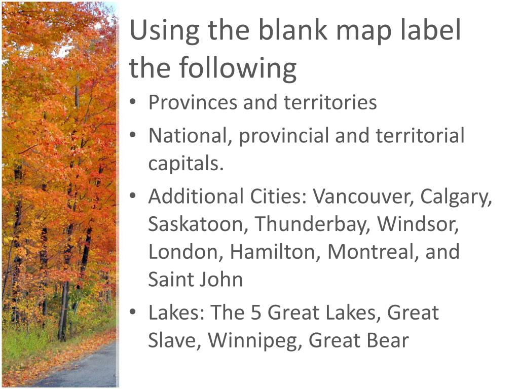 Using the blankmap label the following • Provinces and territories • National, provincial and territorial capitals. • AdditionalCities: Vancouver, Calgary, Saskatoon, Thunderbay, Windsor, London, Hamilton, Montreal, and Saint John • Lakes: The 5 Great Lakes, Great Slave, Winnipeg, Great Bear