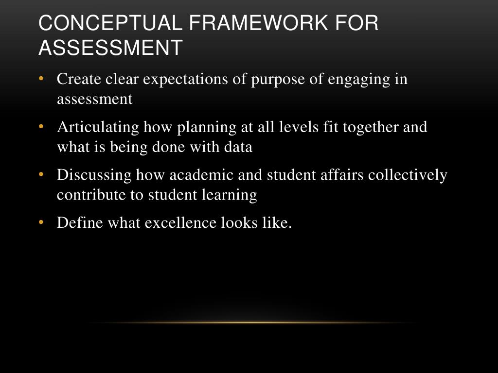Conceptual framework for assessment • Create clear expectations of purpose of engaging in assessment • Articulating how planning at all levels fit together and what is being done with data • Discussing how academic and student affairs collectively contribute to student learning • Define what excellence looks like.