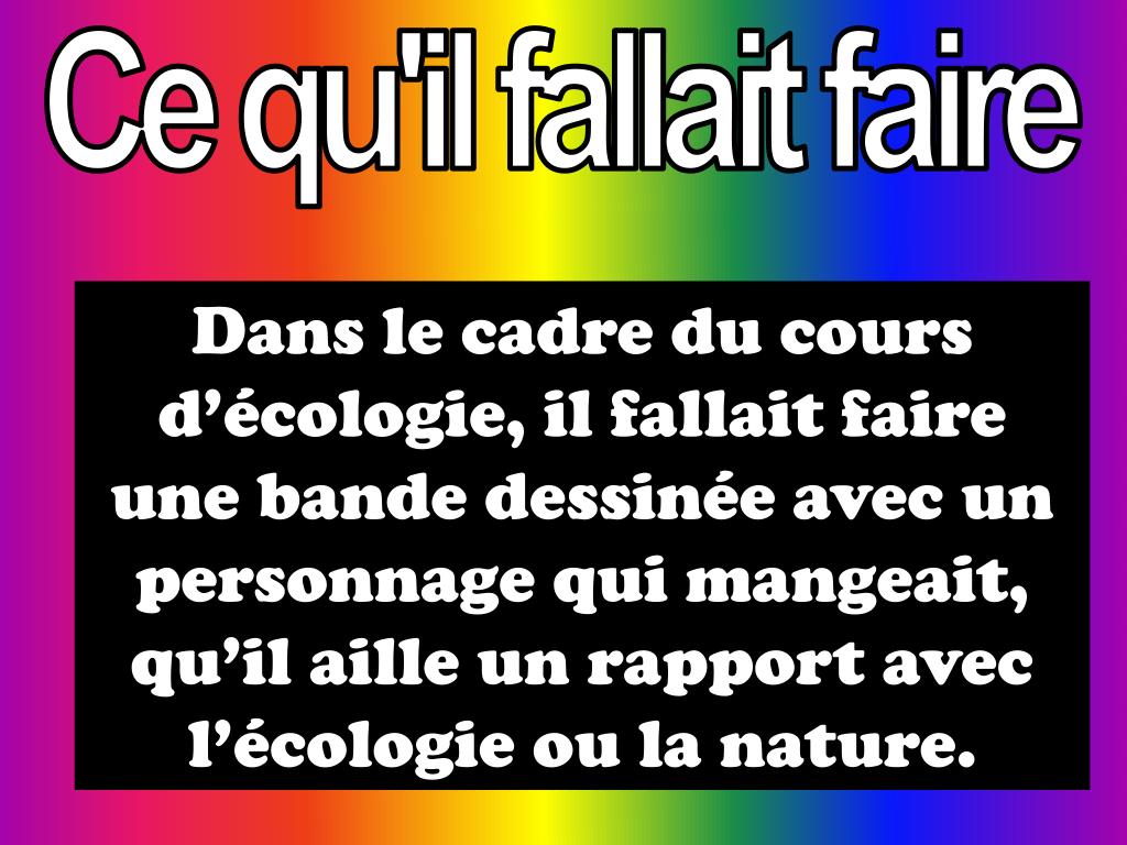 Ce qu'il fallait faire Dans le cadre du cours d’écologie, il fallait faire une bande dessinée avec un personnage qui mangeait, qu’il aille un rapport avec l’écologie ou la nature.