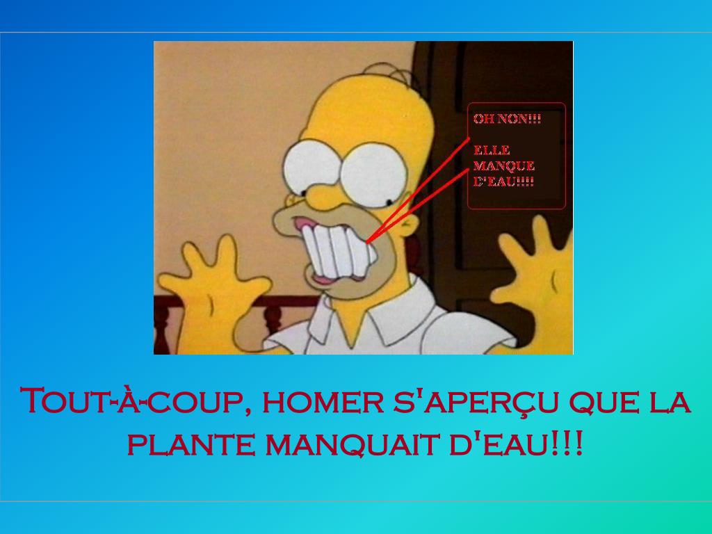 Après que la plante soit arrivée, Marge partie faire ses courses. Elle lui dit: « Salut Homer!!! je serai de retour vers 2 heure!!! occupe toi bien de ma plante!!! »