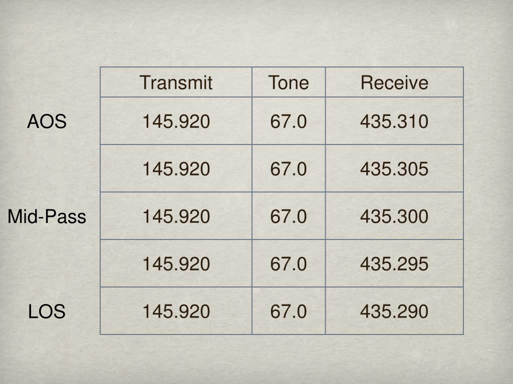 AO-51 Frequencies • Transmit 145.920 • Receive 435.300 + 10 Khz doppler effect • Doppler Effect - satellite coming towards you - the frequency is higher - when the satellite is going away the frequency is lower