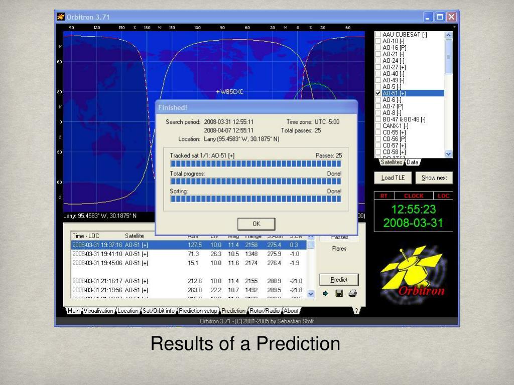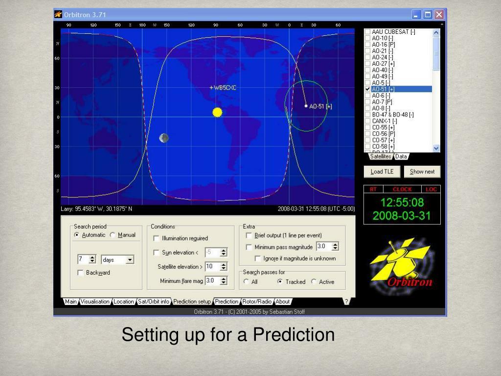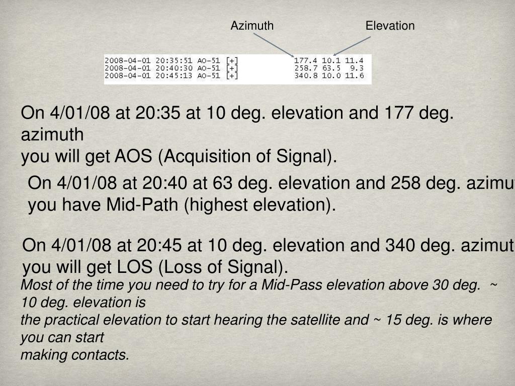 Azimuth Elevation On 4/01/08 at 20:35 at 10 deg. elevation and 177 deg. azimuth you will get AOS (Acquisition of Signal). On 4/01/08 at 20:40 at 63 deg. elevation and 258 deg. Azimuth you have Mid-Path (highest elevation). On 4/01/08 at 20:45 at 10 deg. elevation and 340 deg. Azimuth you will get LOS (Loss of Signal). Most of the time you need to try for a Mid-Pass elevation above 30 deg. ~ 10 deg. elevation is the practical elevation to start hearing the satellite and ~ 15 deg. is where you can start making contacts.