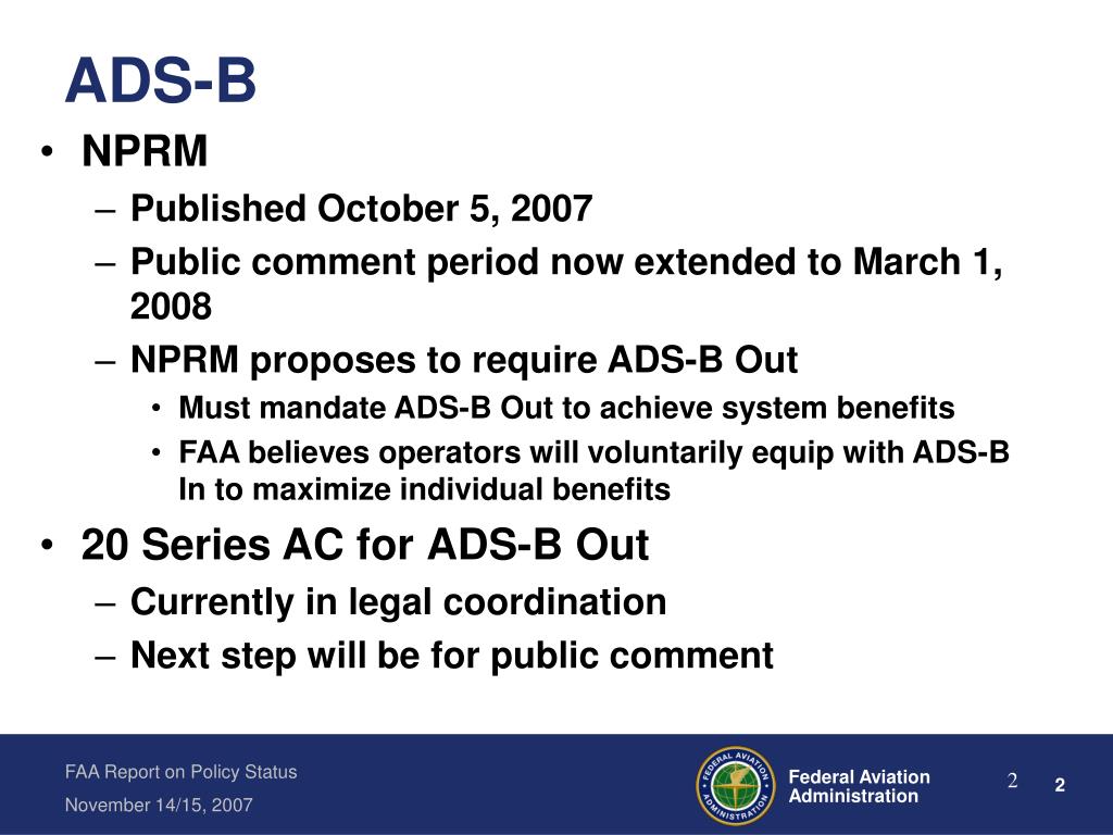 FAA Report on Policy Status and Standards Development. JAA CNS/ATM Steering Group. Brad Miller FAA AIR-130. November 14/15, 2007. ADS-B. NPRM Published October 5, 2007 Public comment period now extended to March 1, 2008 NPRM proposes to require ADS-B Out
