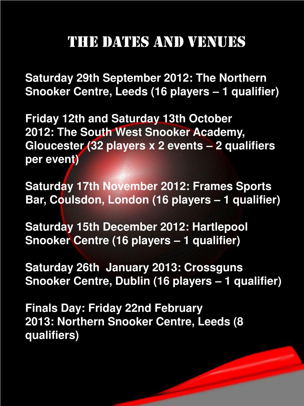 THE DATES AND VENUES Saturday 29th September 2012: The Northern Snooker Centre, Leeds (16 players – 1 qualifier) Friday 12th and Saturday 13th October 2012: The South West Snooker Academy, Gloucester (32 players x 2 events – 2 qualifiers per event) Saturday 17th November 2012: Frames Sports Bar, Coulsdon, London (16 players – 1 qualifier) Saturday 15th December 2012: Hartlepool Snooker Centre (16 players – 1 qualifier) Saturday 26th January 2013: Crossguns Snooker Centre, Dublin (16 players – 1 qualifier) Finals Day: Friday 22nd February 2013: Northern Snooker Centre, Leeds (8 qualifiers)