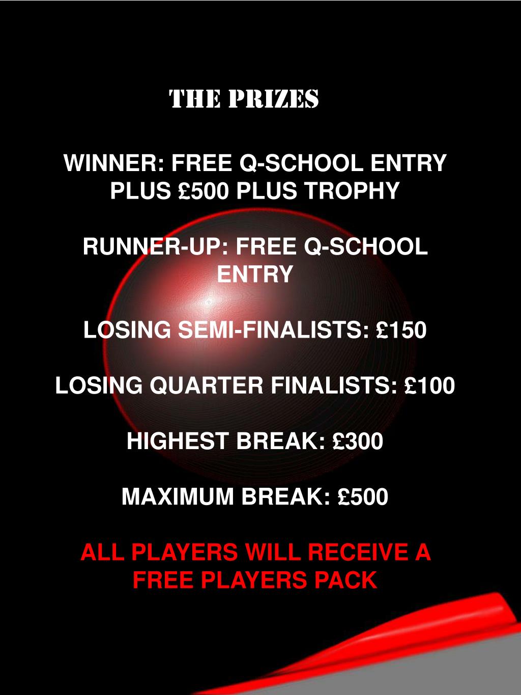 THE PRIZES WINNER: FREE Q-SCHOOL ENTRY PLUS £500 PLUS TROPHY RUNNER-UP: FREE Q-SCHOOL ENTRY LOSING SEMI-FINALISTS: £150 LOSING QUARTER FINALISTS: £100 HIGHEST BREAK: £300 MAXIMUM BREAK: £500 ALL PLAYERS WILL RECEIVE A FREE PLAYERS PACK