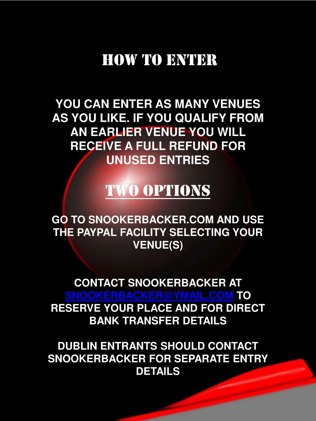 HOW TO ENTER YOU CAN ENTER AS MANY VENUES AS YOU LIKE. IF YOU QUALIFY FROM AN EARLIER VENUE YOU WILL RECEIVE A FULL REFUND FOR UNUSED ENTRIES TWO OPTIONS GO TO SNOOKERBACKER.COM AND USE THE PAYPAL FACILITY SELECTING YOUR VENUE(S) CONTACT SNOOKERBACKER AT SNOOKERBACKER@YMAIL.COM TO RESERVE YOUR PLACE AND FOR DIRECT BANK TRANSFER DETAILS DUBLIN ENTRANTS SHOULD CONTACT SNOOKERBACKER FOR SEPARATE ENTRY DETAILS