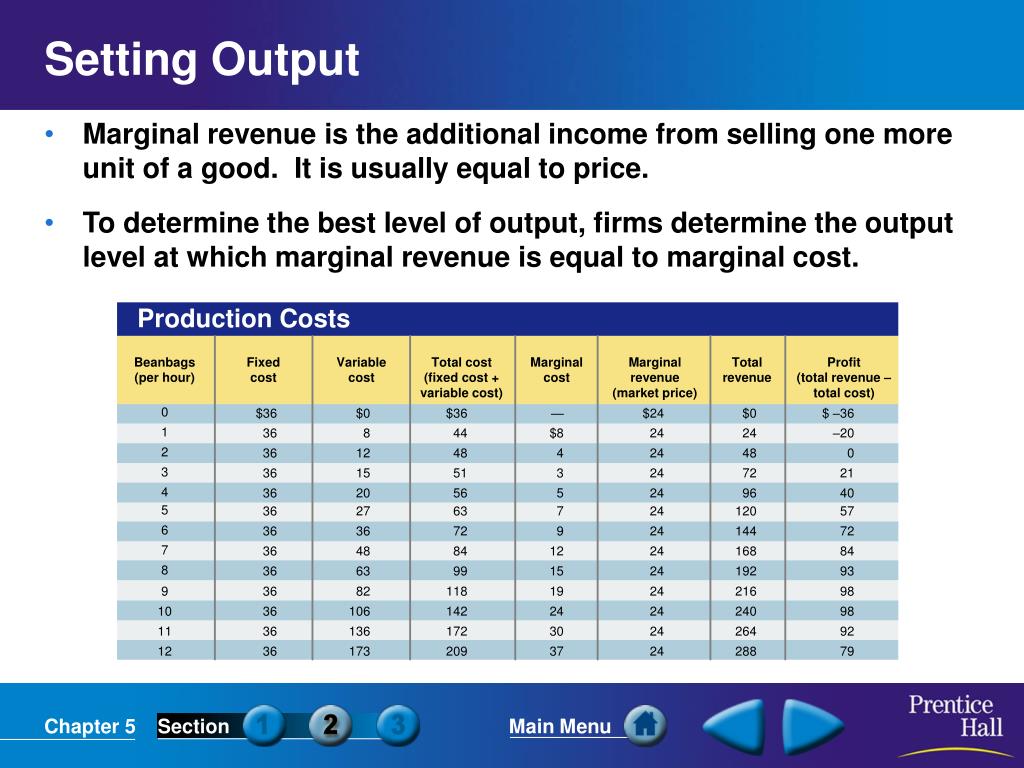 Production Costs Beanbags (per hour) Fixed cost Variable cost Total cost (fixed cost + variable cost) Marginal cost Marginal revenue (market price) Total revenue Profit(total revenue – total cost) 0 1 2 3 4 $36 36 36 36 36 $0 8 12 15 20 $36 44 48 51 56 — $8 4 3 5 $24 24 24 24 24 $0 24 48 72 96 $ –36 –20 0 21 40 5 6 7 8 36 36 36 36 27 36 48 63 63 72 84 99 7 9 12 15 24 24 24 24 120 144 168 192 57 72 84 93 9 10 11 12 36 36 36 36 82 106 136 173 118 142 172 209 19 24 30 37 24 24 24 24 216 240 264 288 98 98 92 79 Setting Output • Marginal revenue is the additional income from selling one more unit of a good. It is usually equal to price. • To determine the best level of output, firms determine the output level at which marginal revenue is equal to marginal cost.