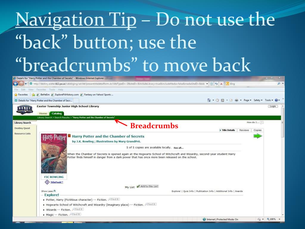 Navigation Tip – Do not use the “back” button; use the “breadcrumbs” to move back Breadcrumbs