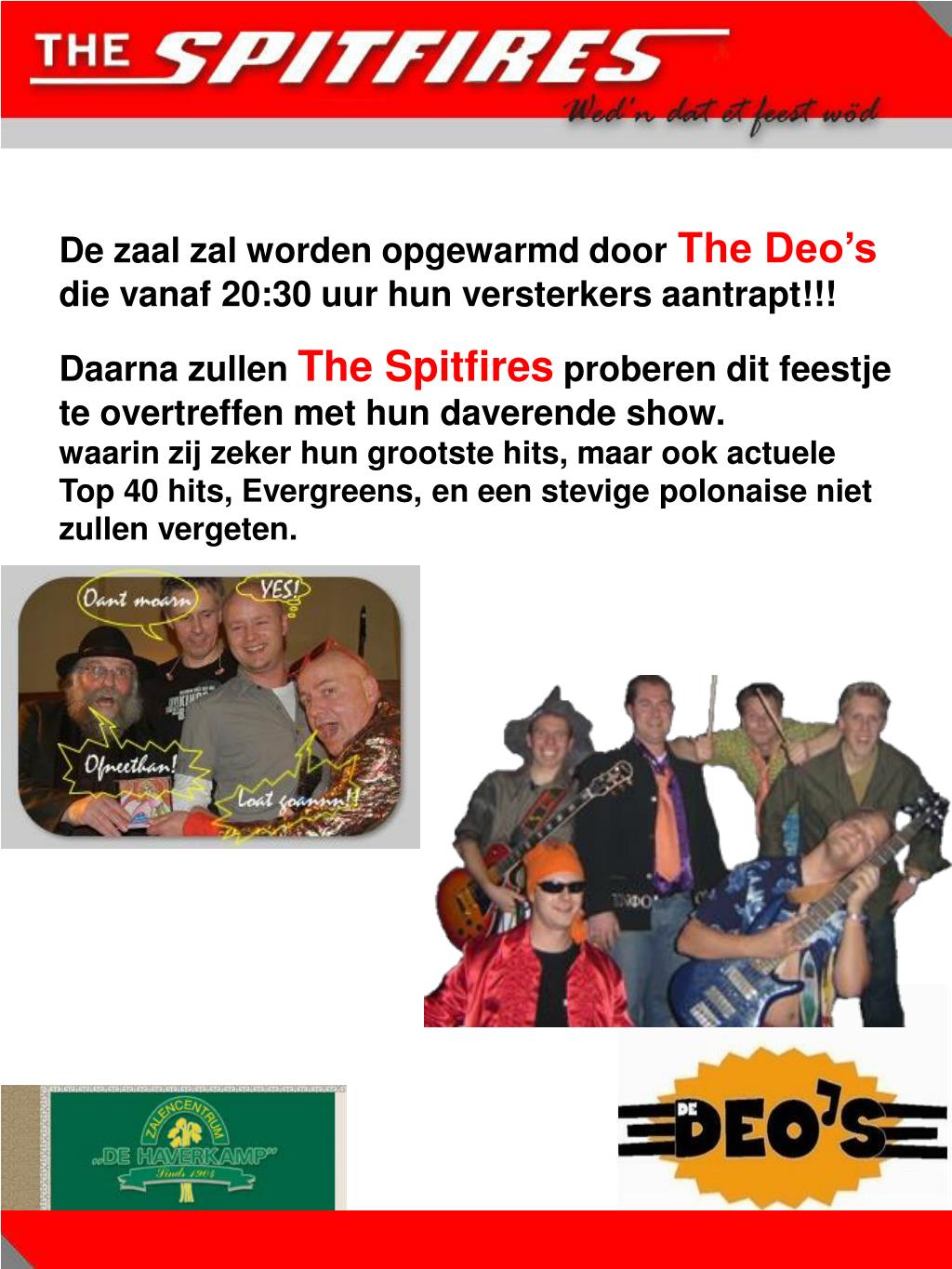 ZATERDAG 21 OKTOBER. De Haverkamp presents;. THE SPITFIRES. &. THE DEO'S. De zaal zal worden opgewarmd door The Deo’s die vanaf 20:30 uur hun versterkers aantrapt!!!