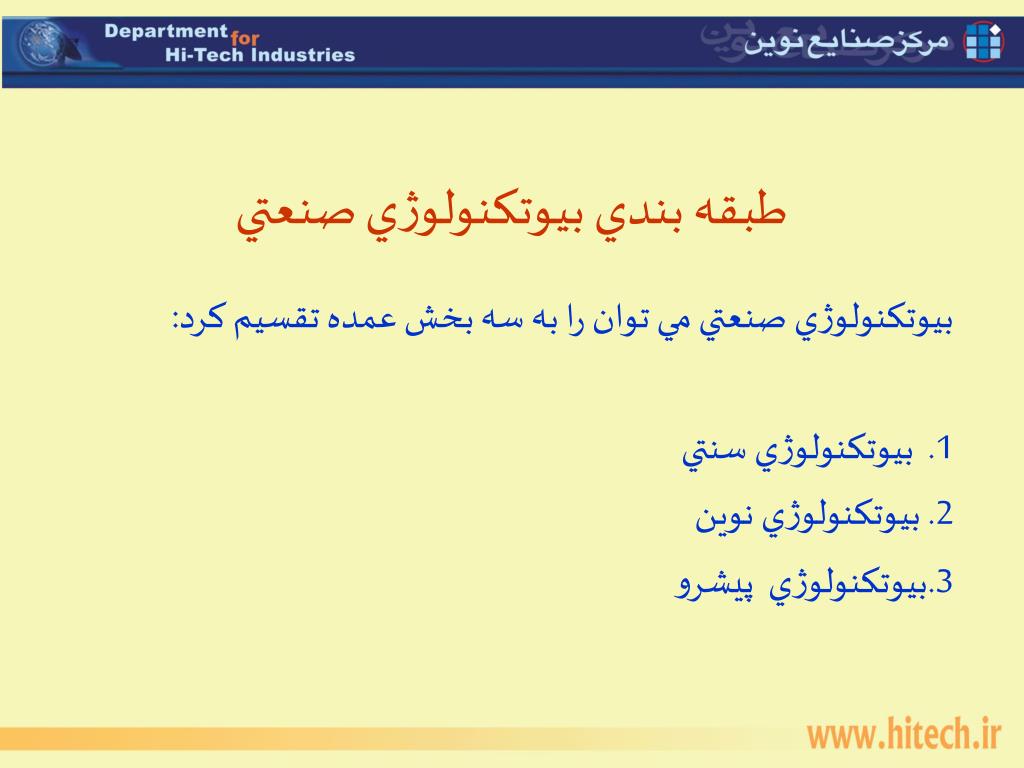 ب ي وتکنولو ژي صنعت ي. طبقه بند ي ب ي وتکنولو ژي صنعت ي. ب ي وتکنولو ژي صنعت ي م ي توان را به سه بخش عمده تقس ي م کرد: 1. ب ي وتکنولو ژي سنت ي 2. ب ي وتکنولو ژي نو ي ن 3.ب ي وتکنولو ژي پ ي شرو. بيوتکنولوژ ي سنت ي. ـ اس ي دها ي آم ي نه ـ اس ي دها ي آل ي